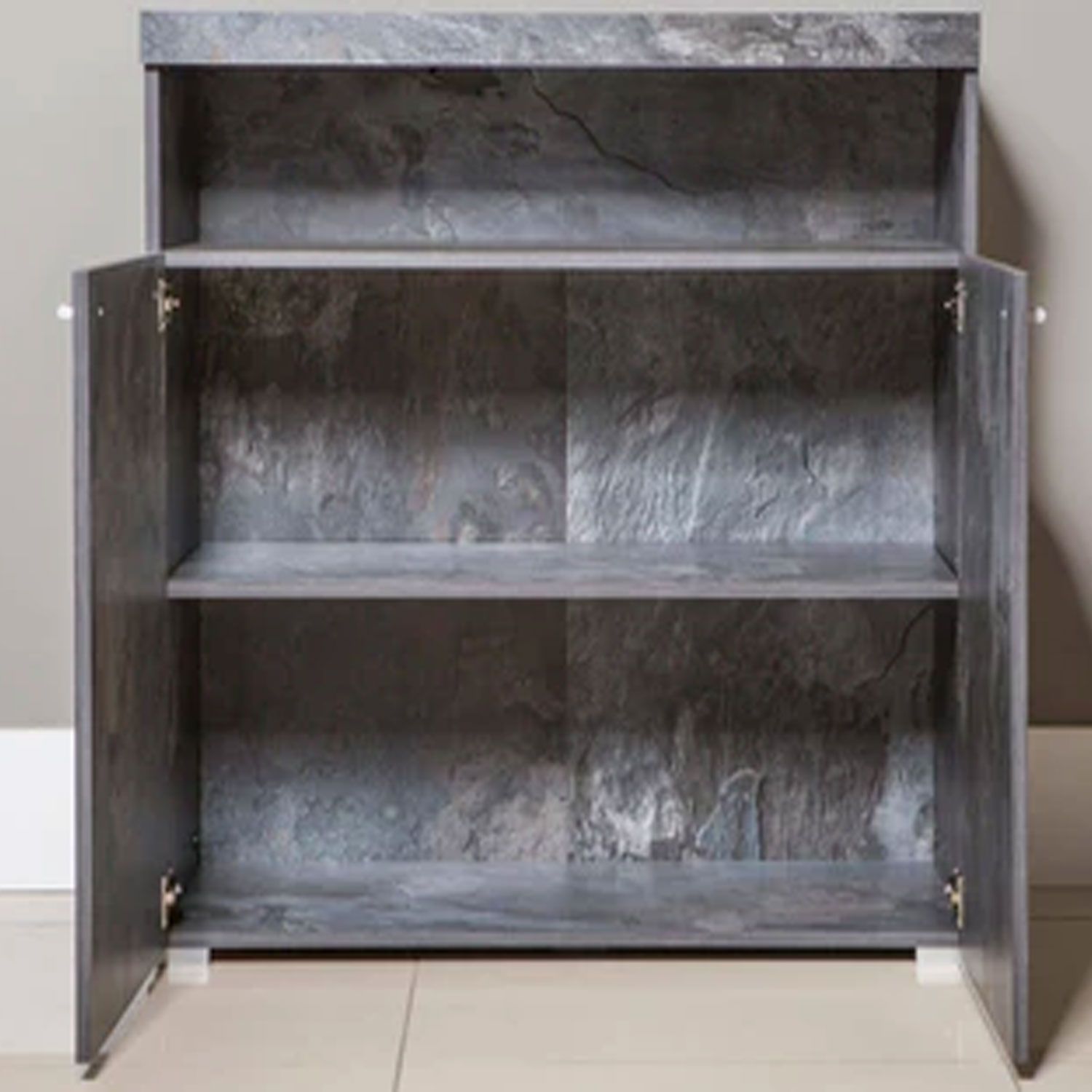 Spruce up your home or office space with this stylish sideboard cabinet. Cleverly crafted and chic in style, it will effortlessly blend in any modern, industrial or contemporary decor. Made from 16mm laminated board, it features two closed and one open compartment for ample storage. This cabinet can be upgraded with LED lights.