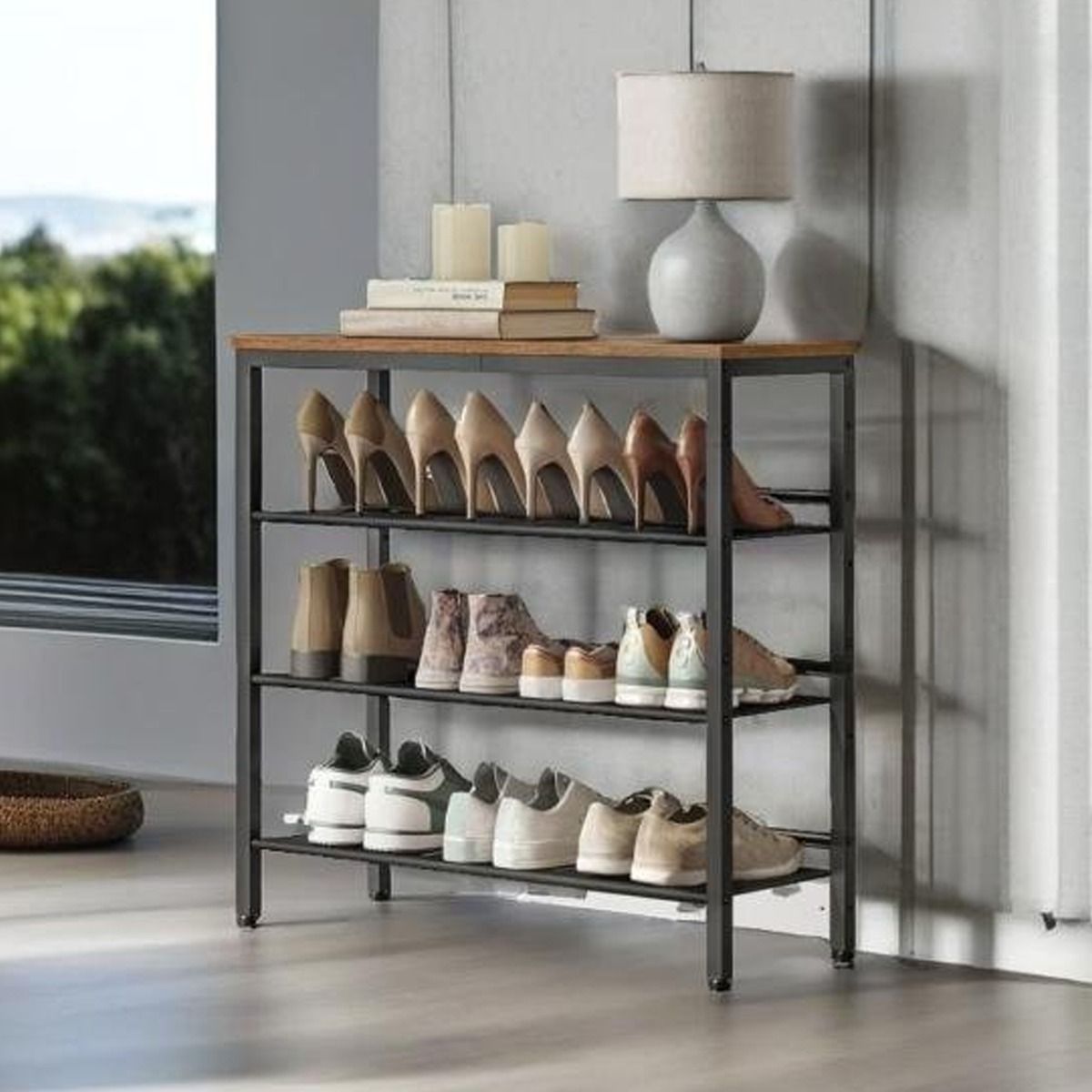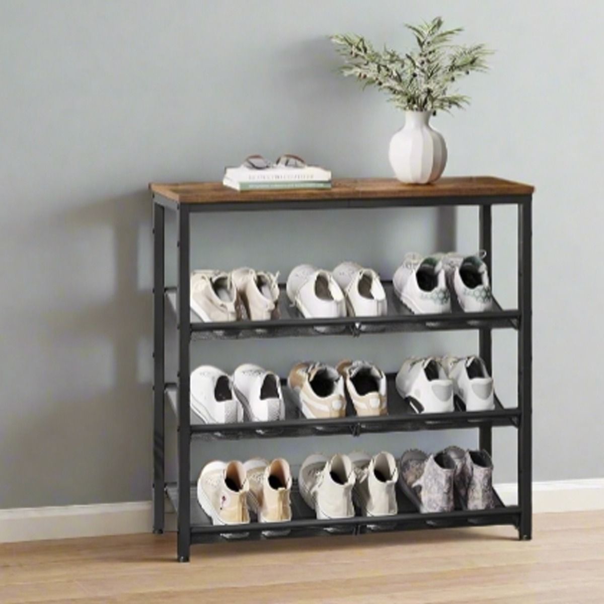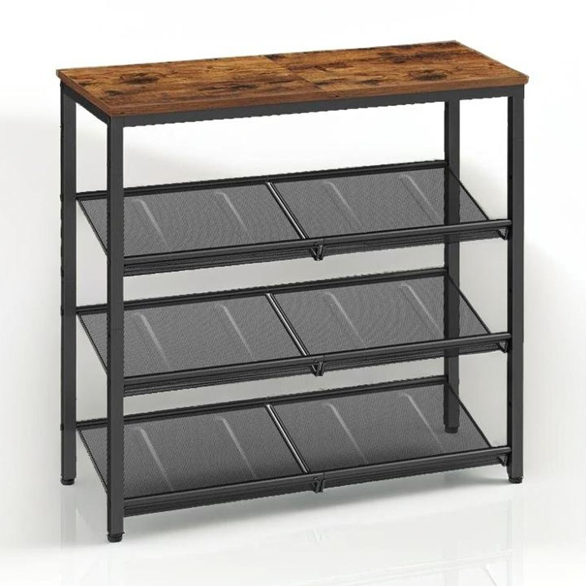 NOVIREX 4-Tier Shoe Rack with Adjustable Mesh Shelves - Rustic Brown and Black