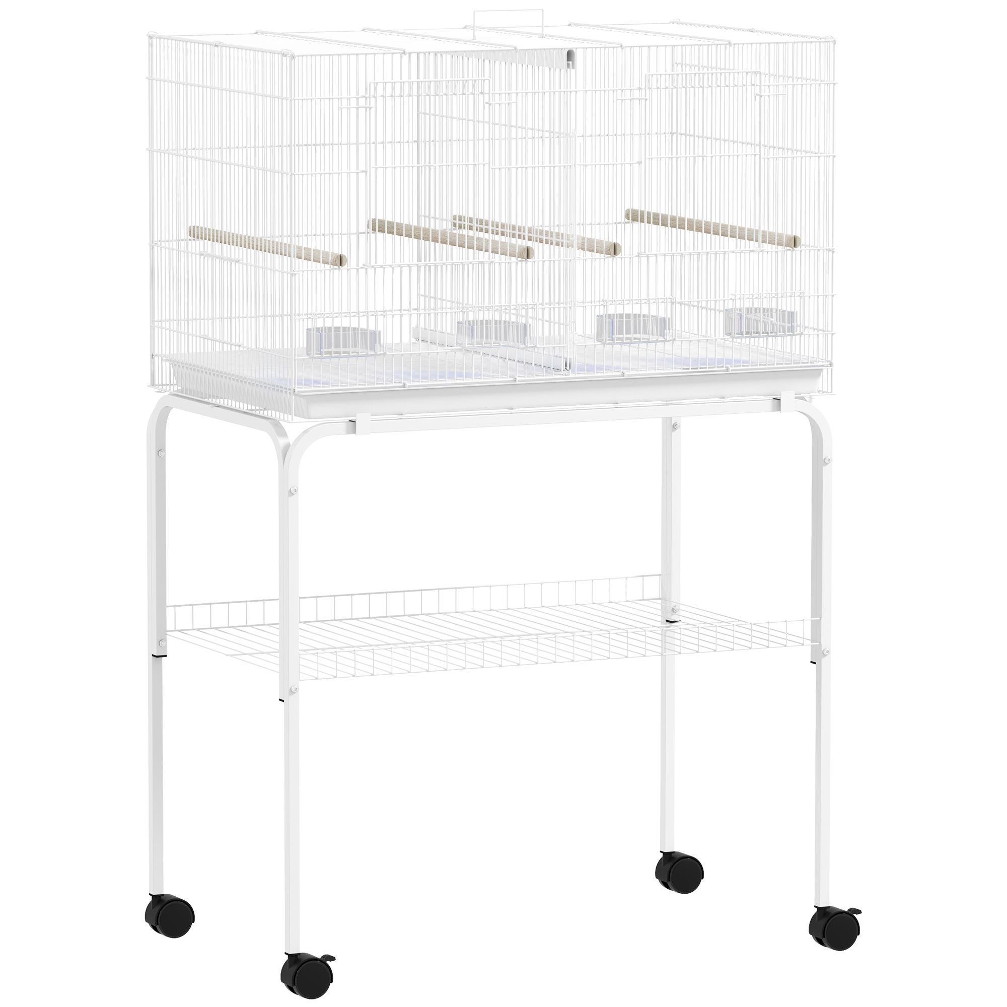 PAWSTER Bird Cage with Divider 4 Wood Perches Slide Out Tray 4 Feeders 76 x 46 x 116cm - White