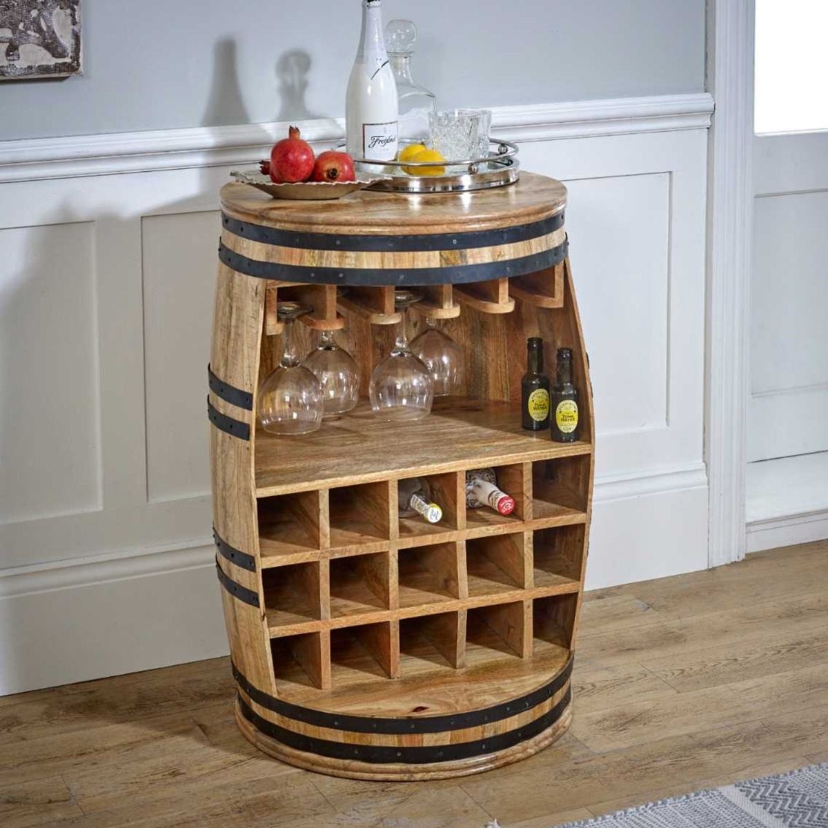 You will receive plenty of compliments and be delighted with this unusual but versatile sideboard. Cleverly designed to have the rustic charm of a wine barrel it has loads of space for wine bottles, glasses, and other accessories, making it a practical choice for wine lovers or anyone looking for extra storage space when entertaining. Made entirely using 100% Eco sourced solid lincoln wood by skilled craftsmen in India.