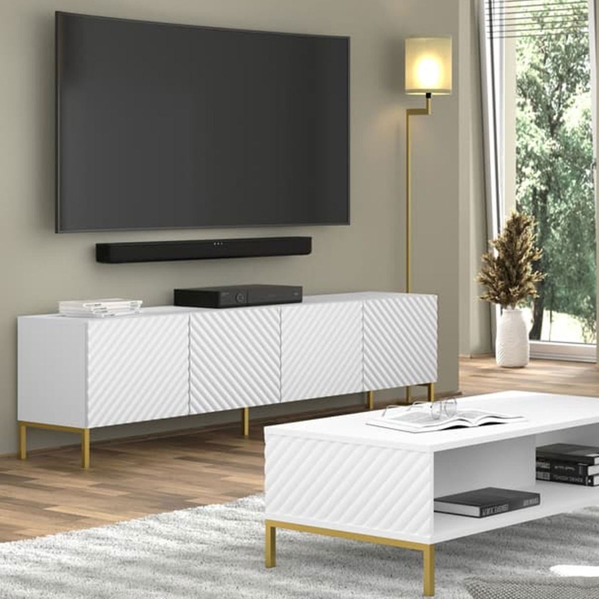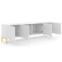 Elevate your entertainment setup with the Puddle Dux 4 Door TV Cabinet—a sleek blend of style and functionality. Boasting four hinged doors with a convenient push-to-open system, it offers easy access to your media essentials. The gold metal legs add a touch of sophistication, while the MDF fronts contribute to its modern aesthetic. Crafted from high-quality 16mm laminated board, this TV cabinet ensures durability and visual appeal. Assembly is required, providing an opportunity to personalize your entertainment space.