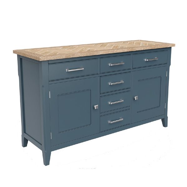 The Ransley Blue collection features meticulous craftsmanship in the hand-finishing process. The oak parquet top undergoes a delicate distressing, followed by the application of a thin layer of white paint that is meticulously hand-rubbed back. The final touch involves a resilient clear lacquer, resulting in a breathtaking and durable appearance. Features six drawers and two cupboards