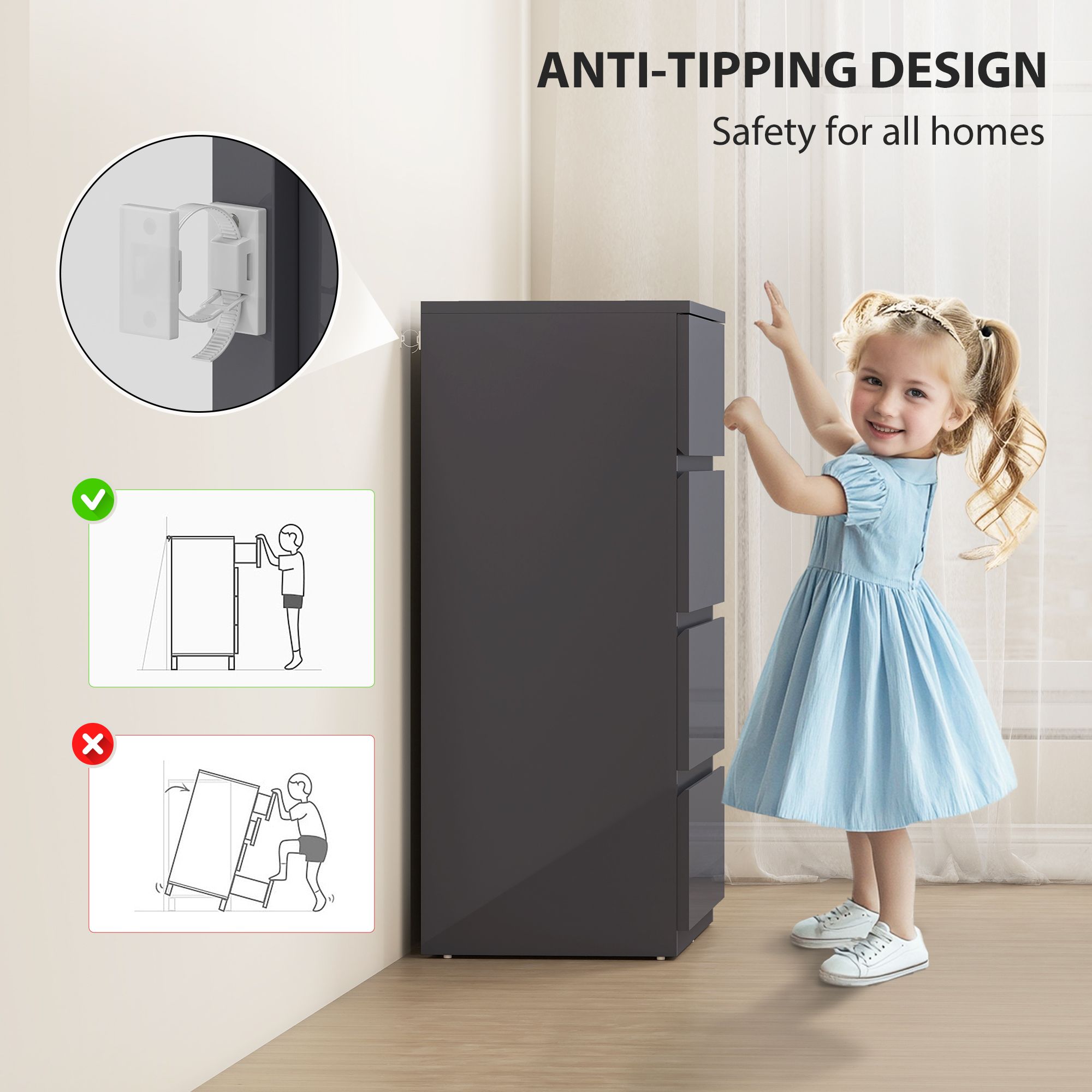 ROWAN High Gloss Grey Chest of Drawers - Medium-sized, 4 Drawers