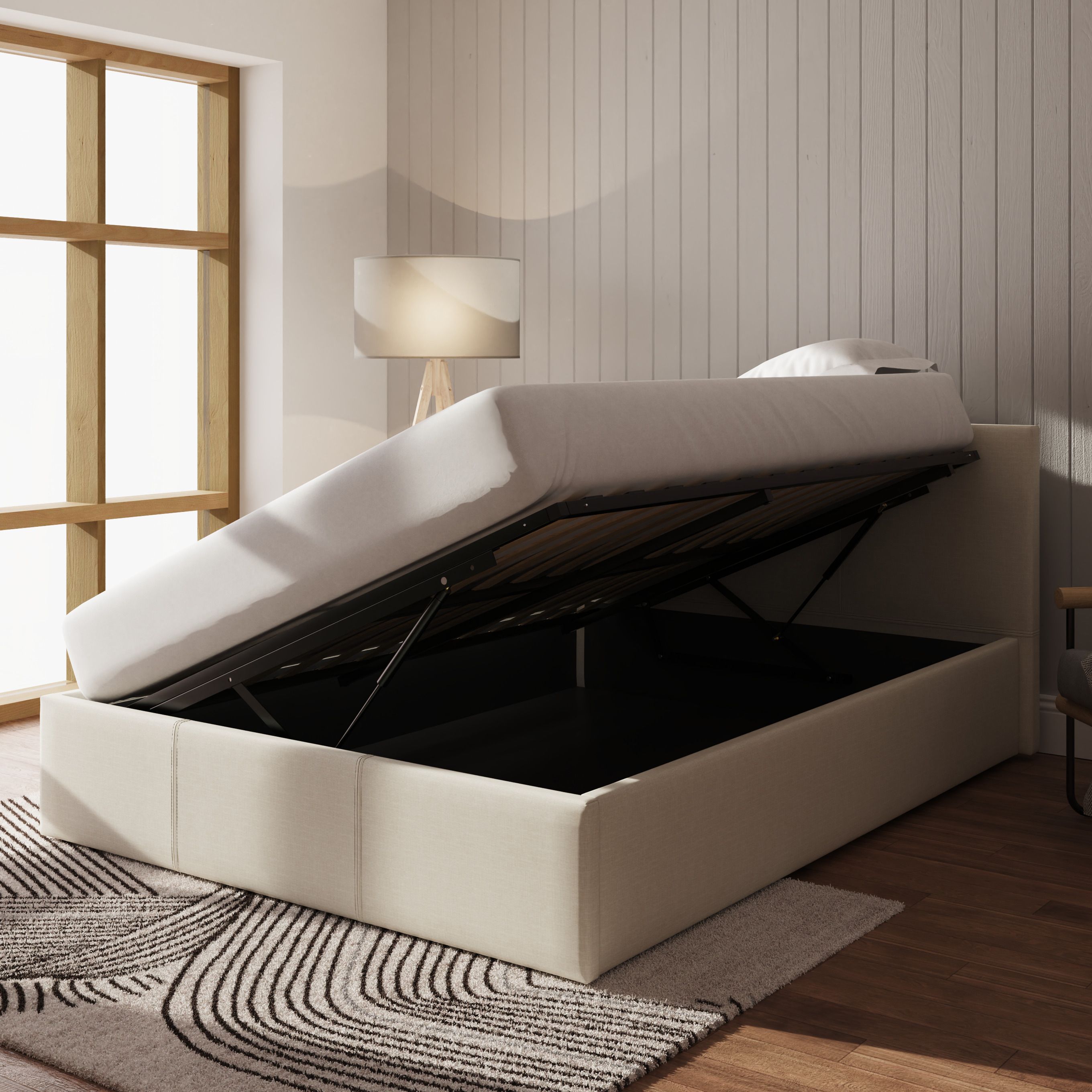 Side Lift Ottoman 4ft Small Double Bed with Stitched Headboard and Hopsack Fabric - Natural