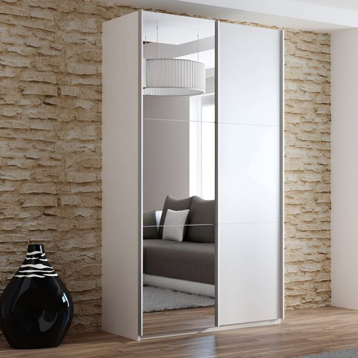 Sliding Wardrobe - BORIS 2 Door Mirrored Wardrobe White 122cm