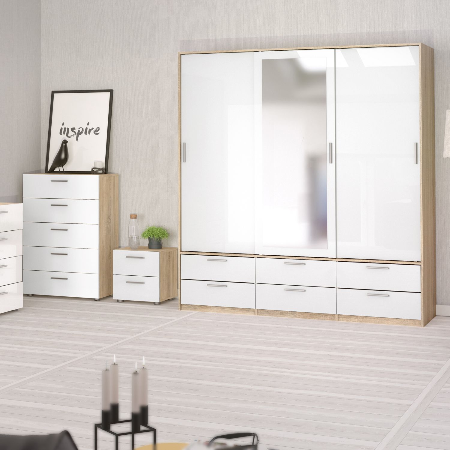 Sliding Wardrobe - LACOSTE 3 Door Mirrored Wardrobe Oak with White High Gloss 181.4cm