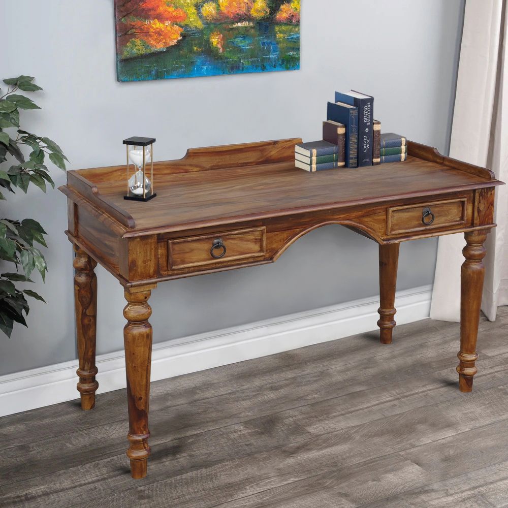 This Sheesham Wood Writing Desk is a beautiful piece of handmade Indian furniture for the home office that will add character and style to any room. The rich honey colour is stunning, and the desk is made from Solid Sheesham Rosewood, making it durable and long-lasting. There are two drawers for storage, making it perfect for use as a home office or study desk. These fine pieces of furniture also serve as Computer Desks, plus, they are also fully handmade in India adding to their unique charm.