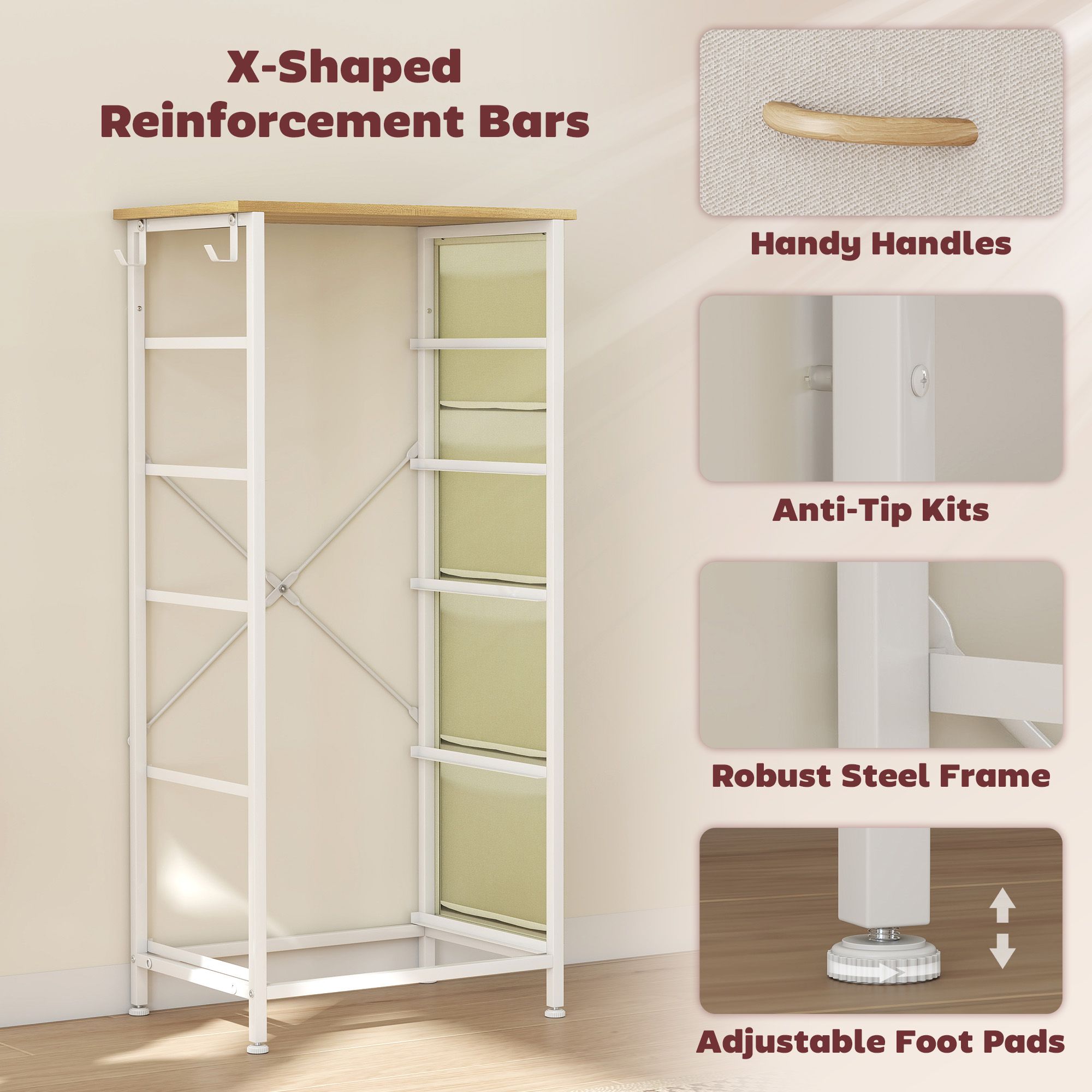 STOWLY Beige Chest of Drawers - Tallboy, Medium-sized, 5 Fabric Drawers