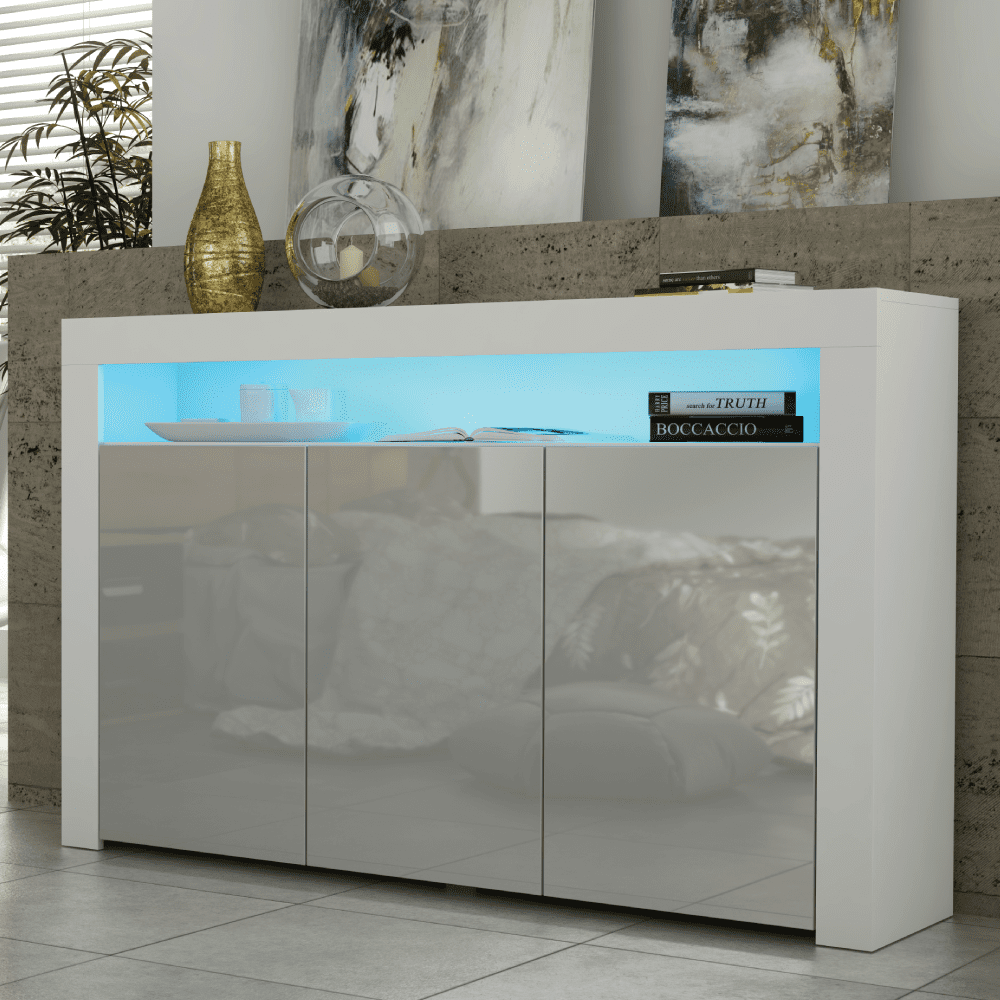 TV Unit Sideboard Cabinet with 3 Doors Storage and Free LED Lighting 155cm - White and Grey