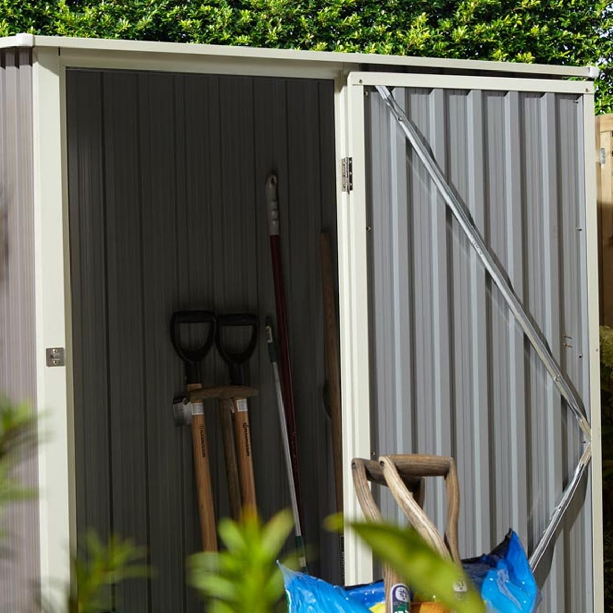Introducing the 5×3 Tyson Metal Apex Shed, a robust and stylish storage solution designed for durability and ease of use. Featuring a pent style roof and a single lockable door (padlock not supplied), this shed offers secure storage for your belongings. Constructed from electro-galvanized and painted steel with a 0.25mm thickness, it is both fire and rot resistant, ensuring long-lasting protection. The shed is painted in dark grey with off-white trim, providing a modern aesthetic that complements any outdoor space.
