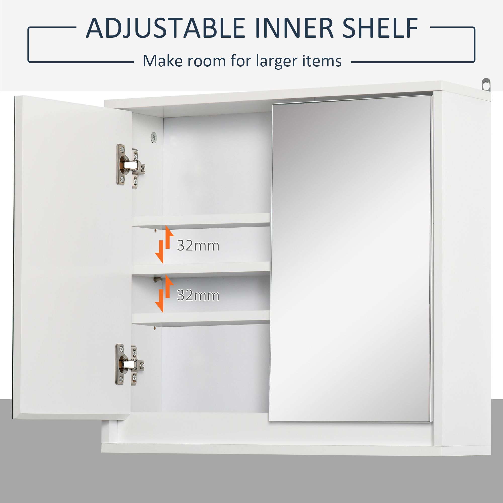 - ADJUSTABLE SHELF: Inside the mirror cabinet, there is an adjustable shelf which can be moved up and down to meet your storage requirements for items of different sizes