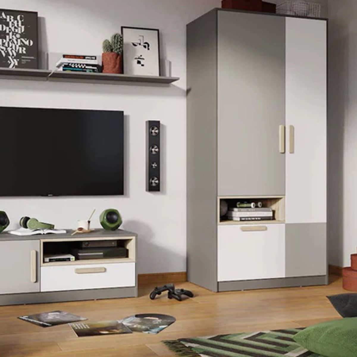 Wardrobe - PORTO 2 Door Wardrobe Grey and White 90cm
